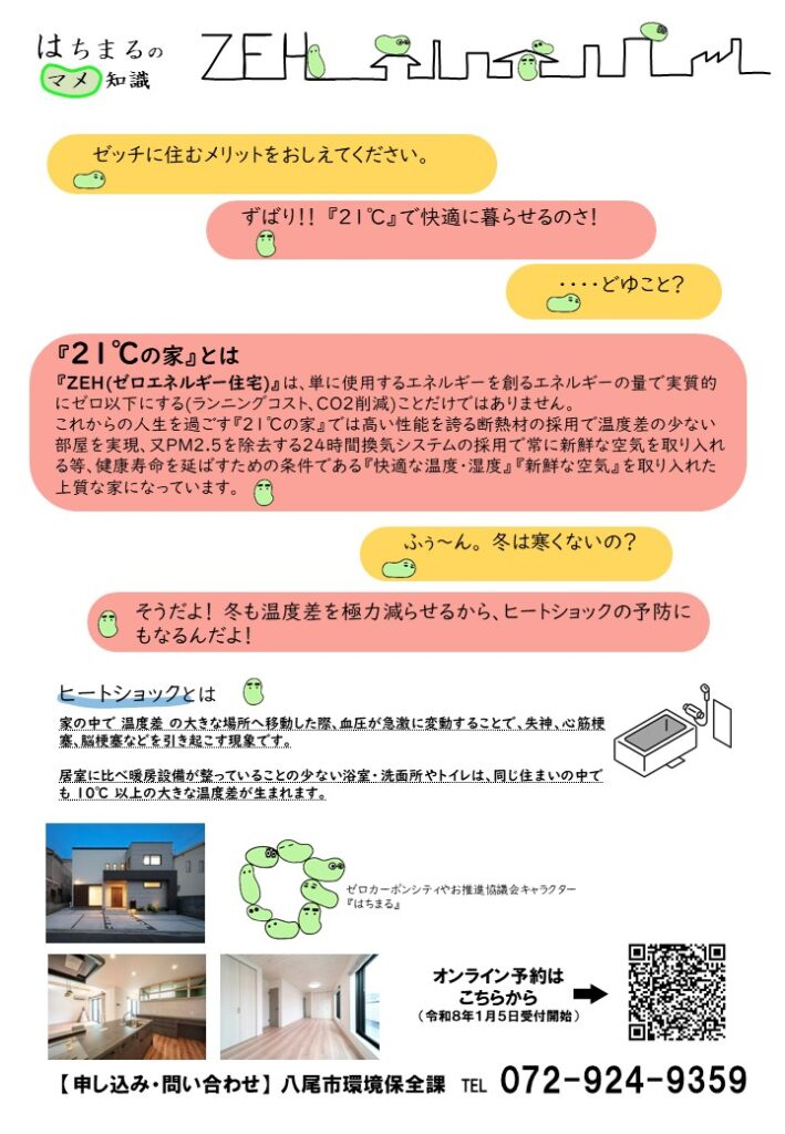 2050年のゼロカーボンシティやおの実現に向けて、住宅において、省エネで環境にやさしく、健康に暮らせるゼロエネルギー住宅(ZEH)を体感いただくため、ZEH見学会を開催いたします!また、見学会当日は、災害時に活用できる電気自動車も見学やソーラーハウスのワークショップ体験もできますので、この機会にぜひご覧ください!