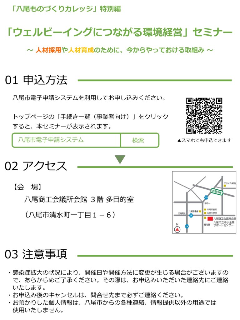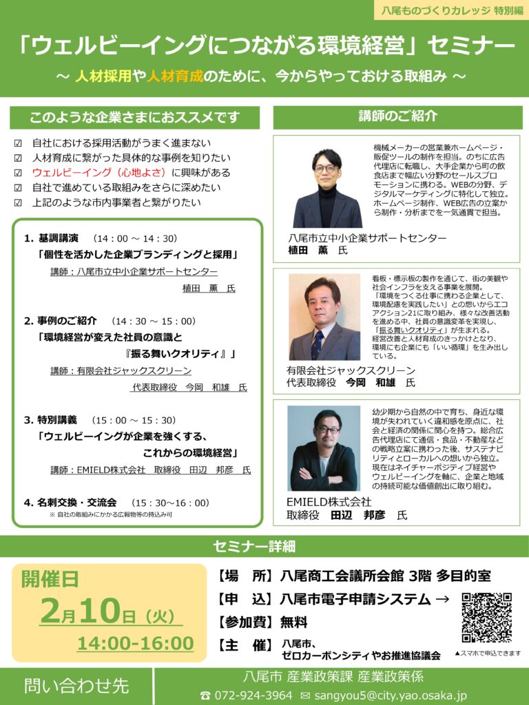 当協議会では、「八尾ものづくりカレッジ」とコラボし、ウェルビーイングについて、これから取り組んでみたい方や、既に取り組んでおり、更に発展させたい方向けに、社員採用や、環境経営の事例紹介などを交えたセミナーを開催します。
